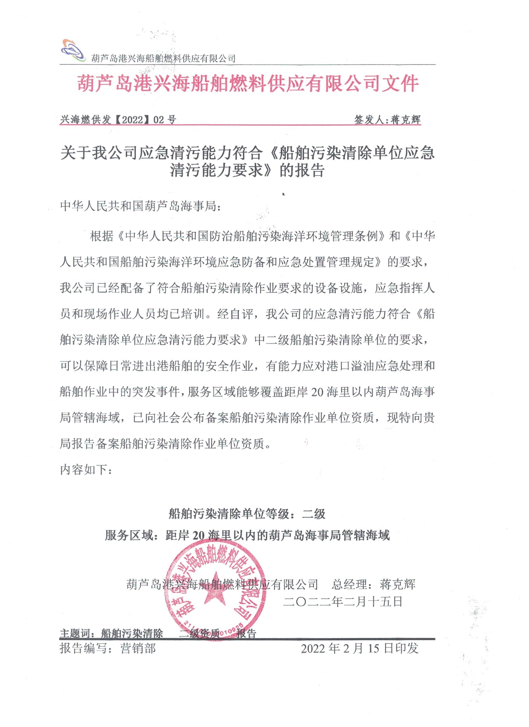 上一篇: 關(guān)于我公司應(yīng)急清污能力符合《船舶污染清除單位應(yīng)急清污能力要求》的報(bào)告
